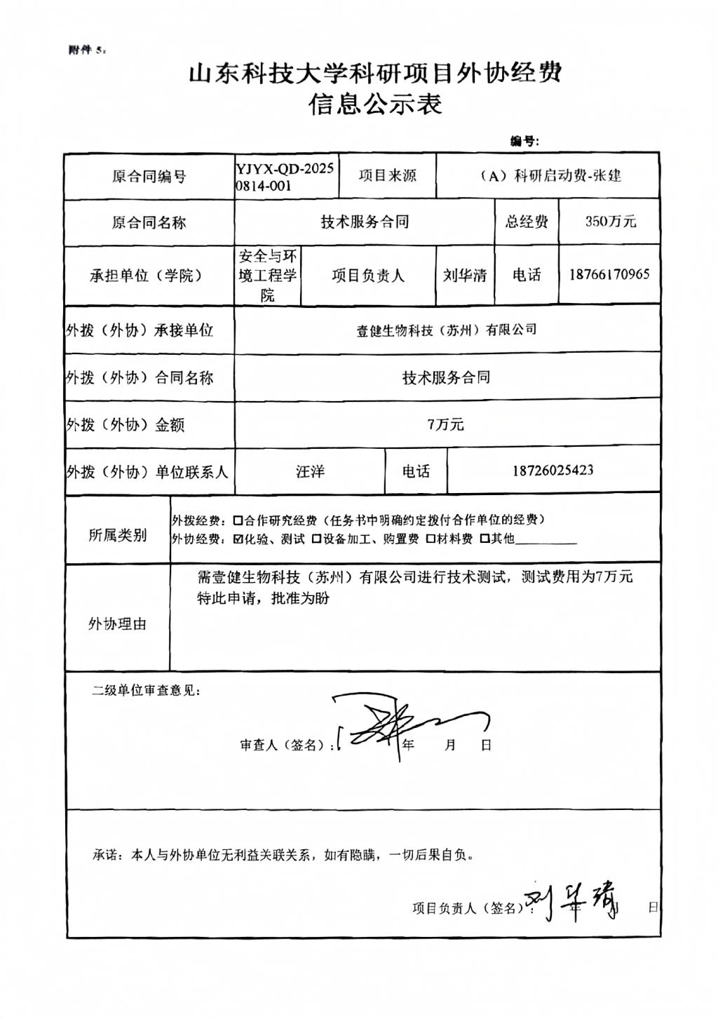 根据《山东省人民政府办公厅印发关于进一步完善财政科研项目资金管理的若干措施的通知》(鲁政办字〔2019〕120号)以及《色情直播 科研项目与经费管理办法(试行)》(山科大发〔2020〕64号)相关规定,现对张建为项目负责人的(A)科研启动经费项目的外协经费情况进行公示,公示时间为2025年10月15日~2025年10月22日(公示时间不少于5个工作日)。若对本项外协经费有异议,请于公示期内向安全与环境工程学院或科技处反映并提交书面材料。