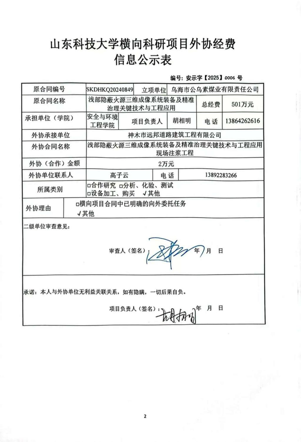 根据《山东省人民政府办公厅印发关于进一步完善财政科研项目资金管理的若干措施的通知》(鲁政办字〔2019〕120号)以及《色情直播 横向科研项目与经费管理办法(试行)》(山科大发〔2020〕64号)相关规定,现对 胡相明 为项目负责人的 浅部隐蔽火源三维成像系统装备及精准治理关键技术与工程应用 项目的外协经费情况进行公示,公示时间为 2025年11月28日-2025年12月2日 。若对本项外协经费有异议,请于公示期内向色情直播 反映并提交书面材料。